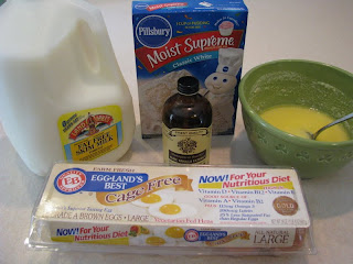 Gather all your cake ingredients: the melted white chocolate chips/butter, cake mix, eggs, vanilla and milk.