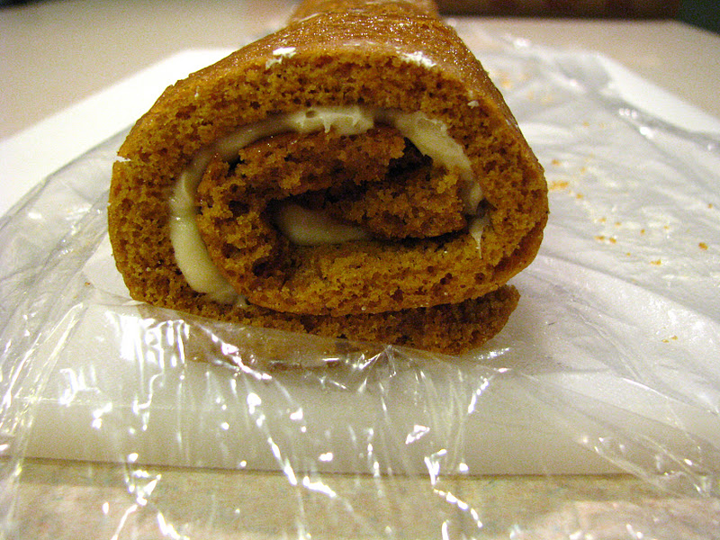 While cake is still warm, roll up in the towel, this will help to shape it so that it doesn't crumble after you frost it. Rolling it lengthwise will give you more servings but they will be small than if you roll it widthwise. (I partially wrapped the cake with the towel before I started to roll it, so that it wouldn't stick to itself.)